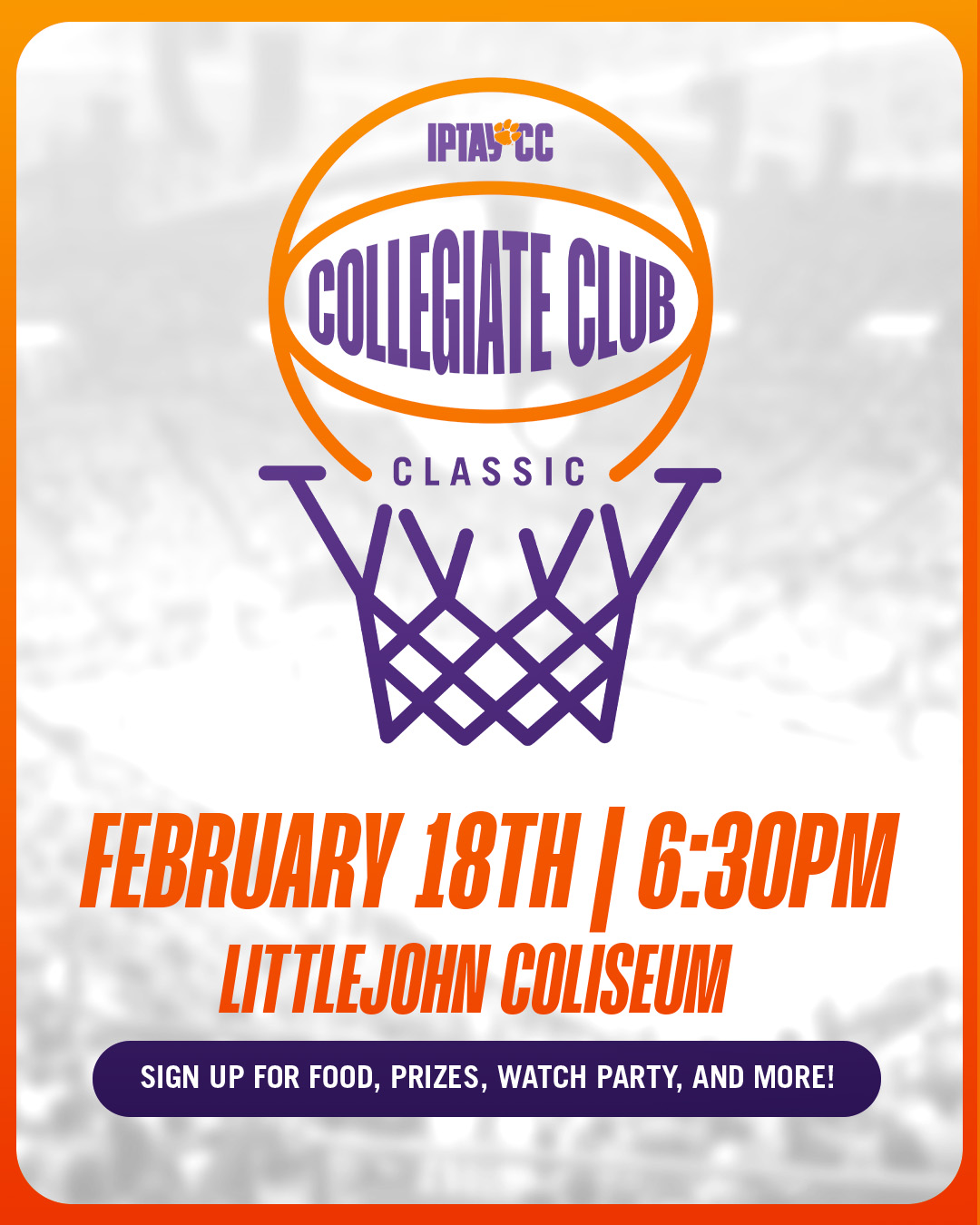 On February 18, 2026, the IPTAY Collegiate Club will host a member event in Littlejohn Coliseum, the Collegiate Club Classic. This event will take place on the floor of Littlejohn, giving you the chance to compete where the Tigers play! This event, similar to the NBA All-Star Skills Challenge, is a time trial where participants test their dribble, pass, layup, and three point shot. Those with the fastest times will have the opportunity to win prizes (check back soon for full prize list!). Tshirts will be available for the first 150 members who register.